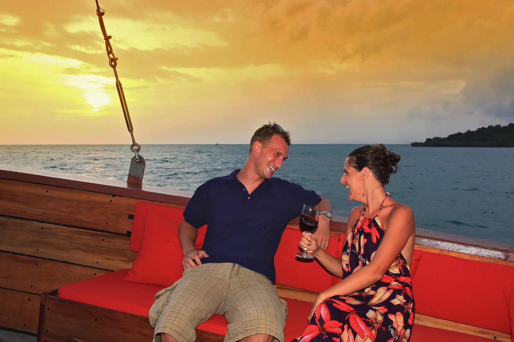 the sunset cruise can begin. This romantic sunset excursion is a fantastic cruise along the northern beaches of Koh Samui. If the sky is clear you can even see all the way to the Angthong National Marine Park. During the tour you can enjoy a delicious buffet with a fine selection of food and beverages. While the soft drinks are included in the tour price, beer and wine as well as cocktails and spirits are sold on board at reasonable prices.