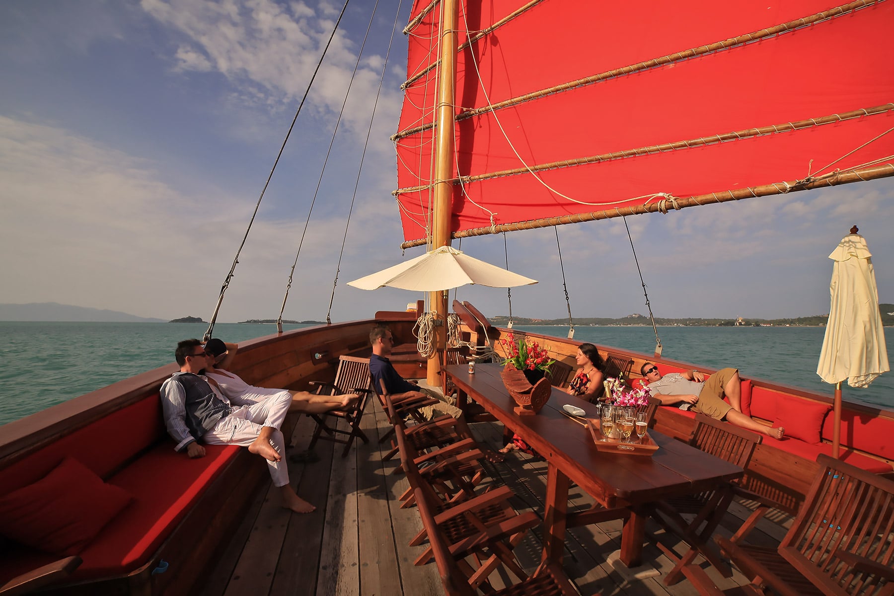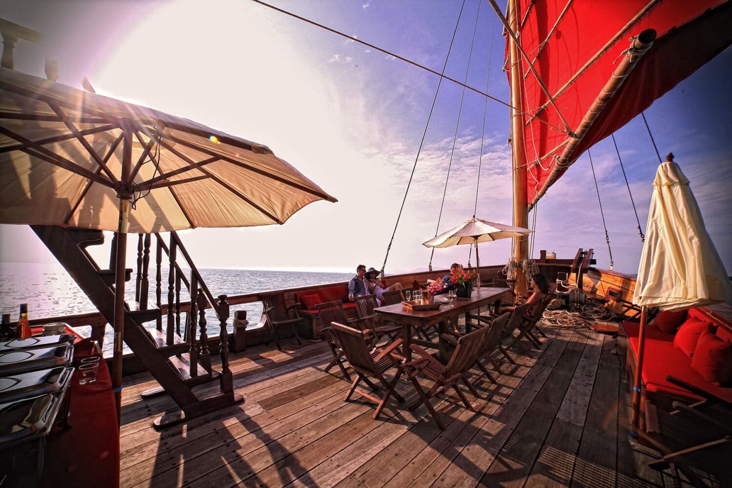 Sailing tour at sunset! Let yourself be enchanted with this romantic excursion! You experience this trip on a traditional yet elegant pirate style sailing ship. It starts in the late afternoon and leads you into the sunset. Experience a relaxing evening as you cruise along the northern shores of Koh Samui. During the tour you will find a nicely prepared buffet with a delicious and rich dinner. The soft drinks are included in the price while plenty of other drinks are available on board for a reasonable fee, too.