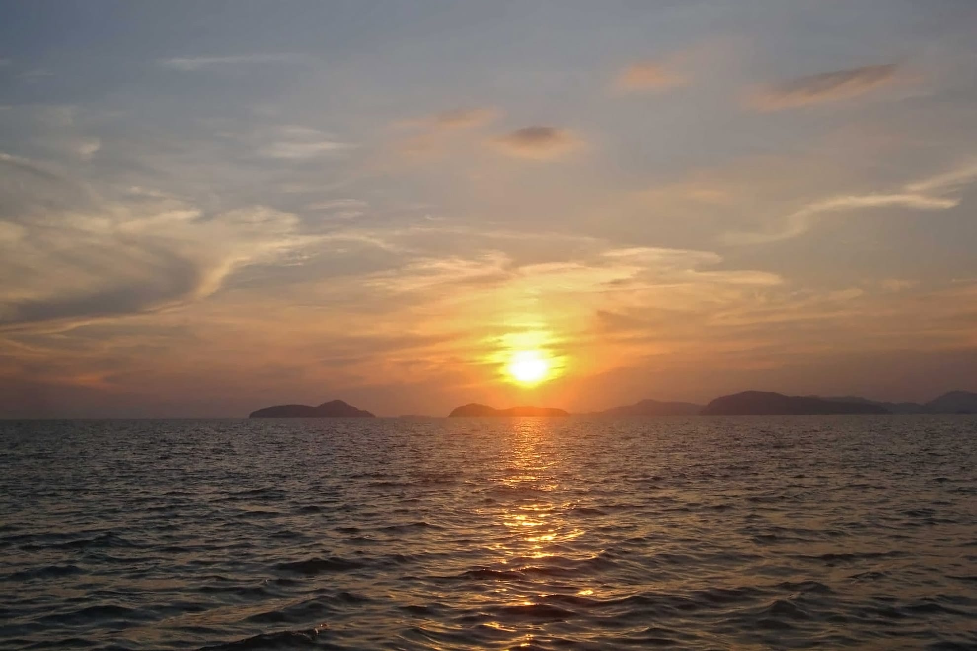 The boat departs back from Thong Nai Pan towards Koh Samui. The ship cruises along the rugged east coast and reaches the open sea between Koh Phangan and Samui at sunset.